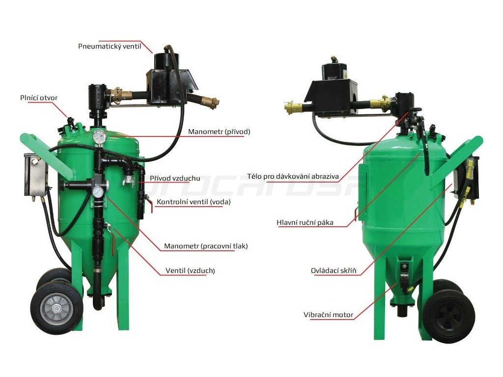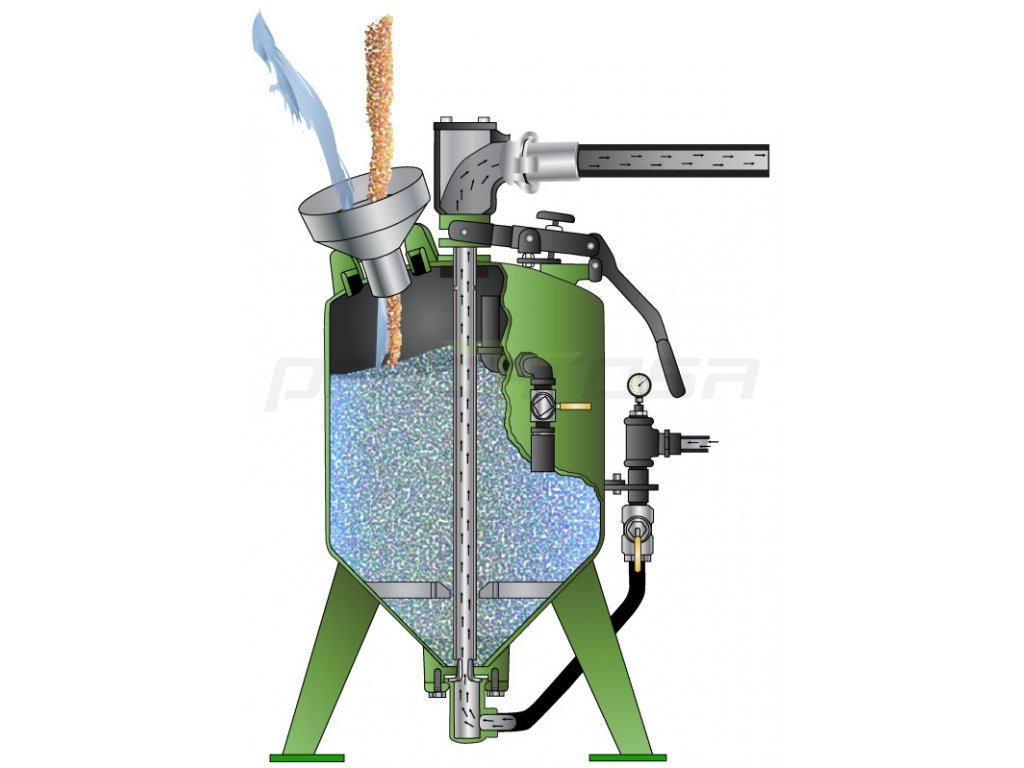 Do jednotky se doplní požadované množství vody, abraziva a případně také inhibitoru koroze, který doporučujeme. Po uzavření nádoby se stlačí hlavní ruční páka a pomocí regulačního šroubu se nastaví množství přisávané směsi do vzduchu. Spínacími kleštěmi u trysky se spustí proces tryskání, který lze v průběhu prací kdykoliv přerušit. Vibrační pneumatický motor na vnější stěně nádoby, zajištuje plynulý a bezproblémový chod jednotky